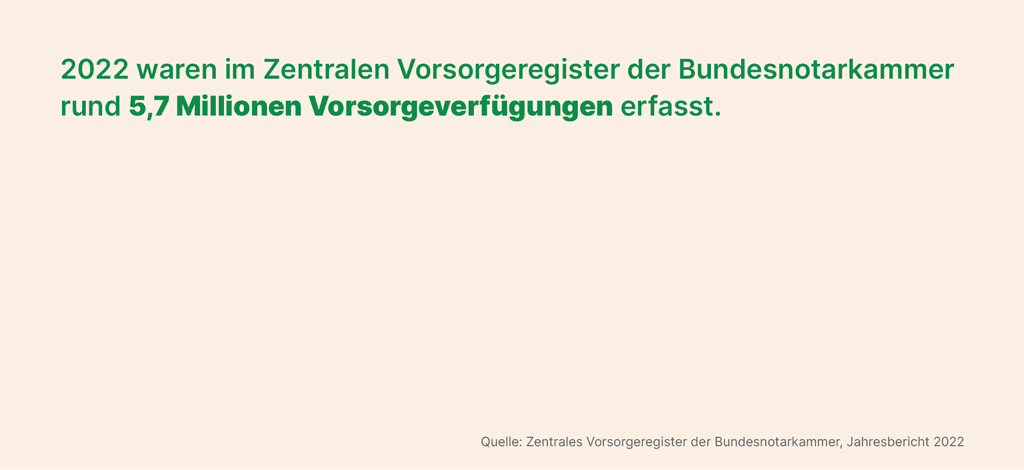 Zudem können Sie die Vorsorgevollmacht im Zentralen Vorsorgeregister der Bundesnotarkammer eintragen lassen. Dort können medizinische Einrichtungen beispielsweise bei Aufnahme einer nicht ansprechbaren oder einwilligungsfähigen Person abfragen, ob eine Patientenverfügung oder Vorsorgevollmacht vorliegt.