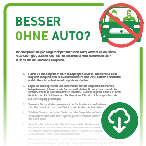 Den Schlüssel einfach wegzunehmen oder das Auto zu verkaufen, ist keine gute Idee, denn damit können Sie sich unter Umständen strafbar machen – schließlich handelt es sich bei dem Fahrzeug um das Eigentum Ihres Angehörigen. Maßnahmen sind ohnehin meist wirkungsvoller, wenn Sie auf Einsicht beruhen. Mit unseren Tipps gehen Sie ein klärendes Gespräch überlegt und strukturiert an. Leidet Ihr Angehöriger unter einer Demenz, haben Sie allerdings eine besondere Fürsorgepflicht. Hier können kleine Notlügen („Das Auto ist gerade kaputt“) hilfreich sein. Womöglich ist Ihrem Angehörigen aber auch gar nicht bewusst, dass es Grund zur Sorge gibt. Die schweizerische Beratungsstelle für Unfallverhütung bietet einen umfassenden digitalen Fahrsicherheitscheck an – dieser Onlinetest ersetzt zwar keine ärztliche Einschätzung, kann jedoch Einschränkungen sichtbar machen.