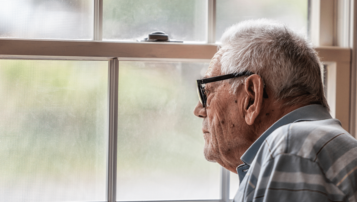 Ein Mann, der an Demenz erkrankt ist, starrt aus dem Fenster.
