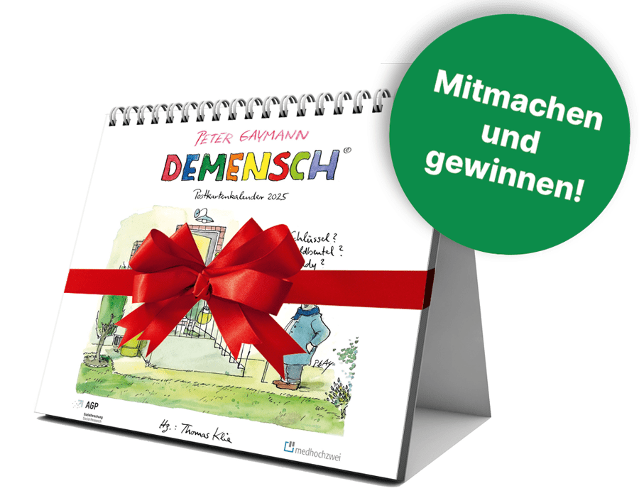 Wir verlosen drei DEMENSCH-Kalender 2025. Der Cartoonist Peter Gaymann und Sozialwissenschaftler Thomas Klie liefern zum 13. Mal humorvoll-inspirierende Einblicke in den Alltag mit Demenz – visuelle Leckerbissen und Gesprächsstoff für ein ganzes Jahr. Die Verlosung erfolgt mit freundlicher Unterstützung des medhochzwei-Verlags.