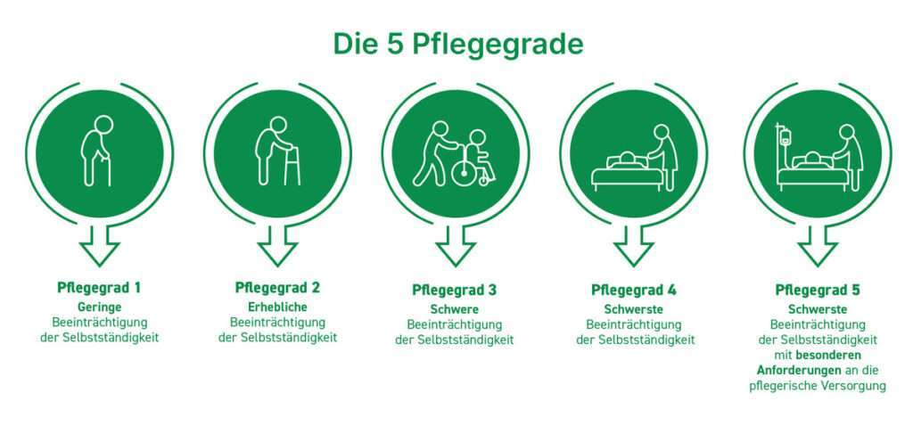 In Deutschland gibt es 5 Pflegegrade. Was jeder Pflegegrad bedeutet, erfahren Sie in der nachstehenden Abbildung.