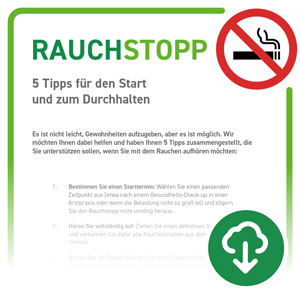 - Nehmen Sie Unterstützung in Anspruch: Es gibt viele hilfreiche Tools, beispielsweise in Form von Apps oder Rauchfrei-Programmen. Besuchen Sie auch das unabhängige Informationsportal des Bundesinstituts für Öffentliche Gesundheit rauchfrei-info.de – hier erhalten Sie Informationen und ein Ausstiegsprogramm.